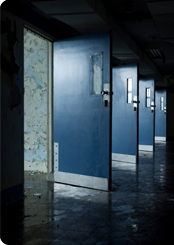 The invocation here of the full moon is no accident.  Many, perhaps even most, of the photographs generated by those poking around abandoned asylums appropriate a horror film aesthetic. In an interview with the online magazine Dazed Digital, the London-based photographer Jenny Hardcore was asked what inspired her to visit and photograph an abandoned asylum. “I have always held a visual fascination with places that unsettle the viewer,” she answers.  “I used to spend a lot of time watching horror movies and this visit was very much like walking into a set for me, but a set with very a real history and tangible humanity.”