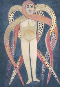 Au rez-de-chaussée de la Halle Saint Pierre, une femme-poisson aux pieds de tête de mouton nous regarde des ses cinq yeux bleus grand ouverts. L’auteur de ce portrait est un des 49 créateurs représentés dans l’exposition « Sous le vent de l’art brut », qui rassemble une petite partie de la collection de Charlotte Zander, abritée au Château de Bönningheim. Sava Sekulic (1902-1989), maçon croate devenu une des figures les plus respectées dans les cercles internationaux de l’art naïf, nous montre des êtres en pleine métamorphose, figures à la fois tristes et fantastiques qu’on dirait avoir posé un moment devant le peintre avant de continuer leur transformation invraisemblable. C’est notamment le cas de cet homme-femme aux bras de pieuvre sous lequel on lit « Krake se transforme en femme et s’autodétruit » (1974) (voir figure). Si cette image peut évoquer la métamorphose aux mille bras solaires du président Schreber, contrairement aux mémoires du « névroptahe » le plus célèbre de l’histoire de la psychiatrie, elle ne prétend pas représenter une expérience subjective. C’est donc bien le fil de l’imaginaire – de notre imaginaire, bien entendu – qui semble constituer le principe de regroupement des œuvres de cet artiste et d’autres « naïfs » avec celles des créateurs présentés au titre de malades mentaux. Il y a ici déjà de quoi intéresser les historiens et anthropologues de la psychiatrie et de la maladie mentale, mais non moins les sociologues de « nos » pratiques culturelles.