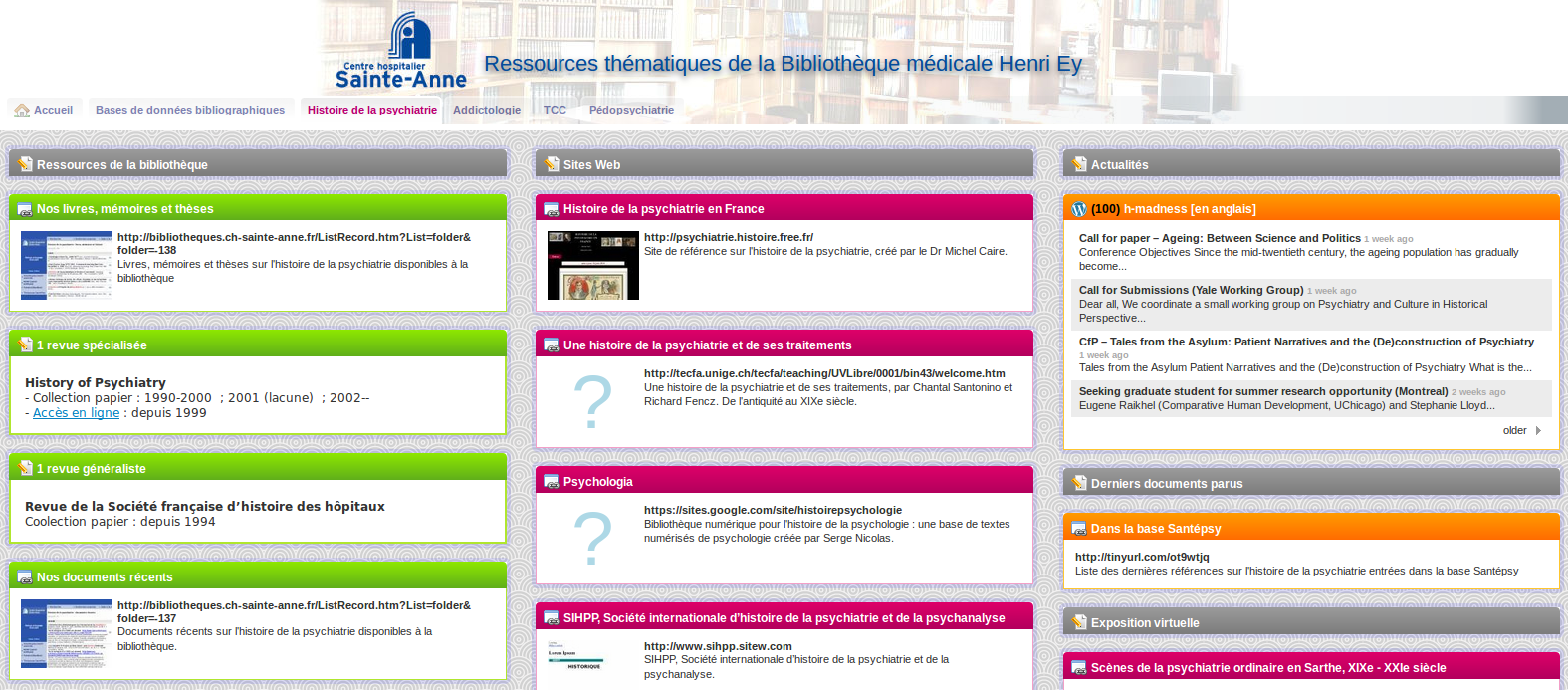 The library Henri Ey at the psychiatric hospital Sainte-Anne in Paris has created a portal that gives access to resources linked to the history of French psychiatry. If there is certainly some work to do on a graphical level, the major databases, blogs, libraries, web-pages are now all brought together on one site.
