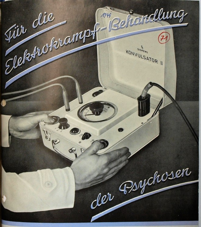 Illustration: SRW Erlangen Technische Entwicklung, Konvulsator II für die Elektrokrampfbehandlung von Psychosen. 1949, in: Veröffentlichungen a.d. Technischen Entwicklung Bd. 4. SRW 1948-1961 p54, Siemens MedArchiv Erlangen, Nr. 71. (Reproduced with the kind permission of the Siemens MedArchiv, Erlangen)
