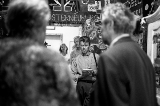 Als im November 2016 das Auktionshaus Sotheby’s Werke aus der Kunstsammlung der Pop-Ikone David Bowie versteigerte, befanden sich darunter auch Arbeiten der sogenannten „Gugginger Künstler“ August Walla, Oswald Tschirtner, Johann Garber und Johann Fischer. Auf Einladung des Künstlers André Heller hatte David Bowie gemeinsam mit dem Musikproduzenten Brian Eno im September 1994 die psychiatrische Einrichtung und das daran angeschlossene „Haus der Künstler“ im niederösterreichischen Gugging bei Klosterneuburg besucht. Entstanden ist dabei eine Serie von 44 schwarz-weiß Fotografien, aufgenommen von der Fotografin Christine de Grancy, die über Vermittlung Hellers diese Zusammenkunft dokumentierte. Gezeigt werden die Arbeiten – die Bowie selbst übrigens nie sah – nun erstmals in der Galerie Crone in Wien.