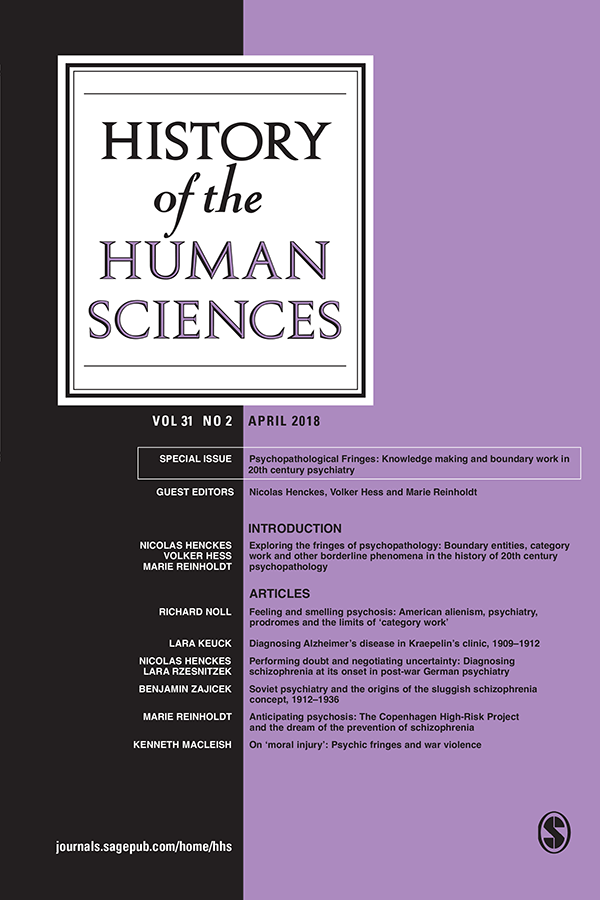 “This special issue of History of the Humane Sciences intends to shed light on a series of psychopathological entities that do not target well defined conditions and experiences, but rather aim at delimiting zones of uncertainty that defy psychopathology’s order of things: mild diagnoses or subthreshold disorders, borderline conditions, culture bound syndromes, or ideas of dimensions and dimensionality. While these categories have come to play an increasingly central role in psychiatric and psychological thinking during the last 50 years, historians and social scientists have had remarkably little to say about how they have been created, what they have been used for, and what kind of realities they have helped to shape. In this introductory article we propose the concept of ‘psychopathological fringes’ to refer to these categories that are located somewhere at the border of psychopathological classifications and refer to zones of conceptual underdetermination. The notion of fringes serves to highlight both the conceptually and the socially marginal nature of the conditions, personal identities, and worlds delimited by these categories. The fringes of psychopathology are zones of vagueness, of epistemic uncertainty, and moral ambiguity. This introduction proposes a first incursion in these zones. It suggests some of the reason why they might have had attracted little interest in the past and why they may be more salient recently. It follows some analytical clues that might help chart a way through it and proposes a map through the collection of articles included in this issue”.