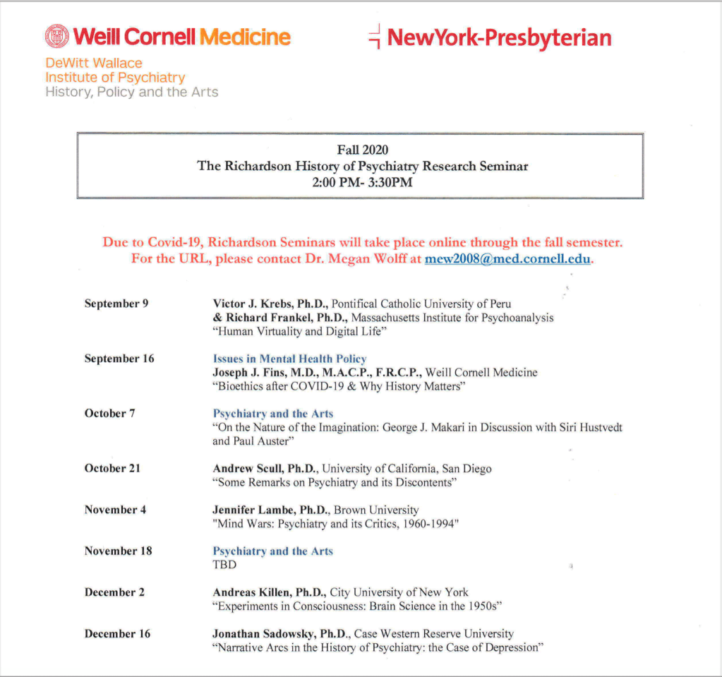 The Institute of Psychiatry: History, Policy, & the Arts is pleased to announce that it will be reconvening its Richardson Seminars online at the start of the fall semester. Please join us bi-weekly beginning on September 9 as we hear scholars from a range of backgrounds discuss their work on psychiatry as it intersects with history, science, and society. Feel free to distribute the attached schedule widely.