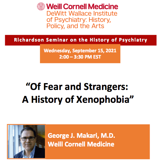 George Makari’s new book, Of Fear and Strangers: A History of Xenophobia will be presented by the author as part of the Richardson Series on the History of Psychiatry on September 15th 2:00-3:30pm EST.