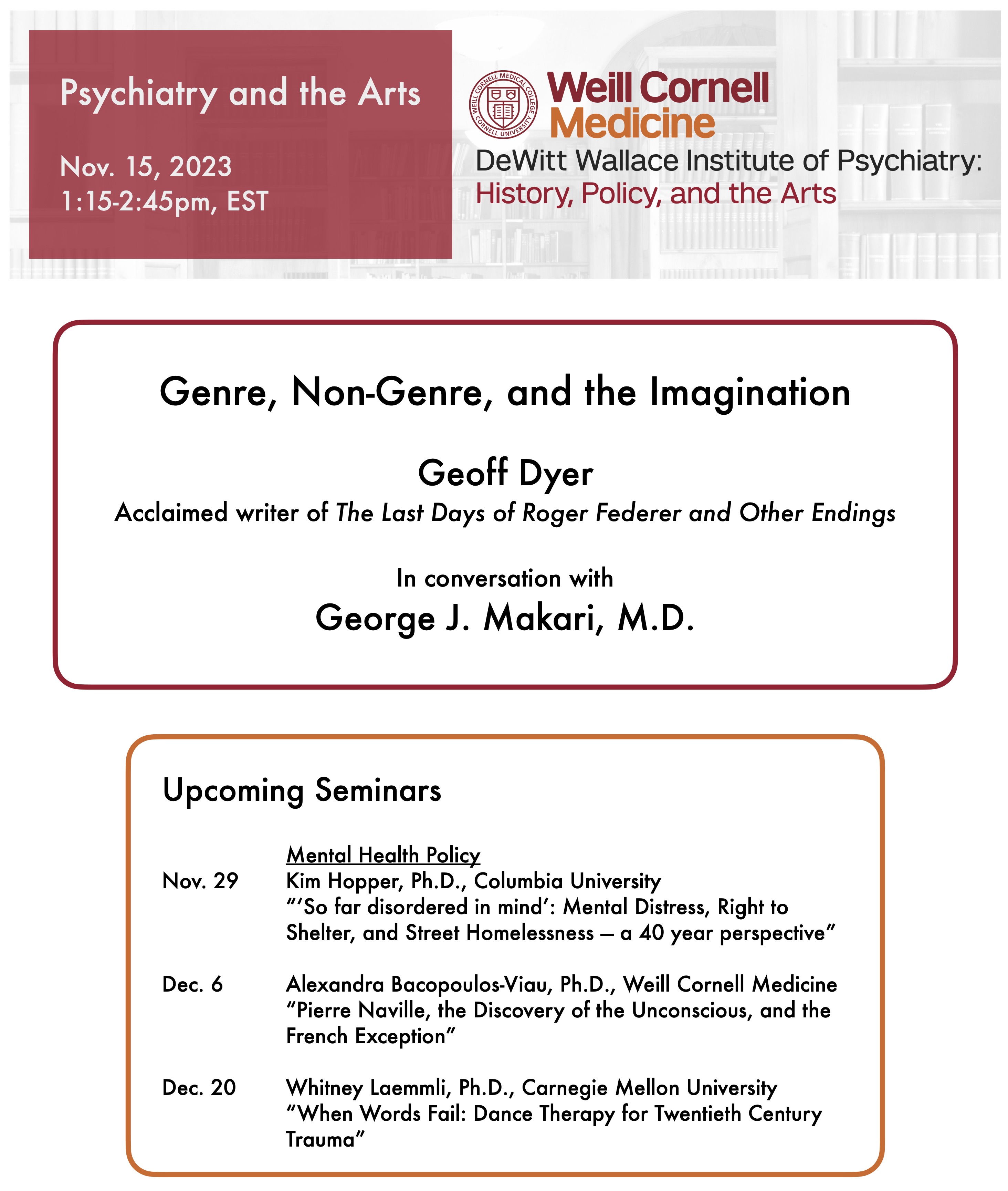 Please join us for the next seminar in our Psychiatry and the Arts Series, on November 15 at 1:15pm EST. Geoff Dyer, the acclaimed author, will join George J. Makari, M.D. for a discussion on “Genre, Non-Genre, and the Imagination.”