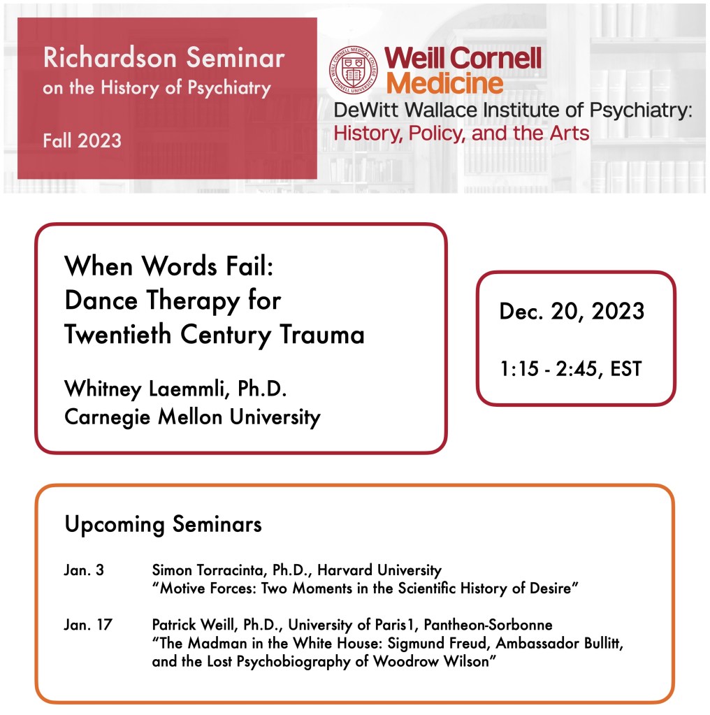 Please join us on Dec. 20, 1:15-2:45pm EST, for the next Richardson Seminar on the history of psychiatry. We will be joined by Whitney Laemmli, Ph.D., Assistant Professor of History at Carnegie Mellon University, for a presentation titled “When Words Fail: Dance Therapy for Twentieth Century Trauma.”