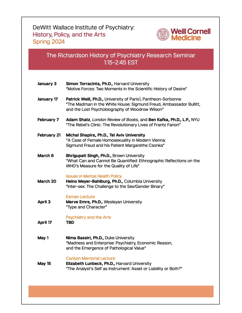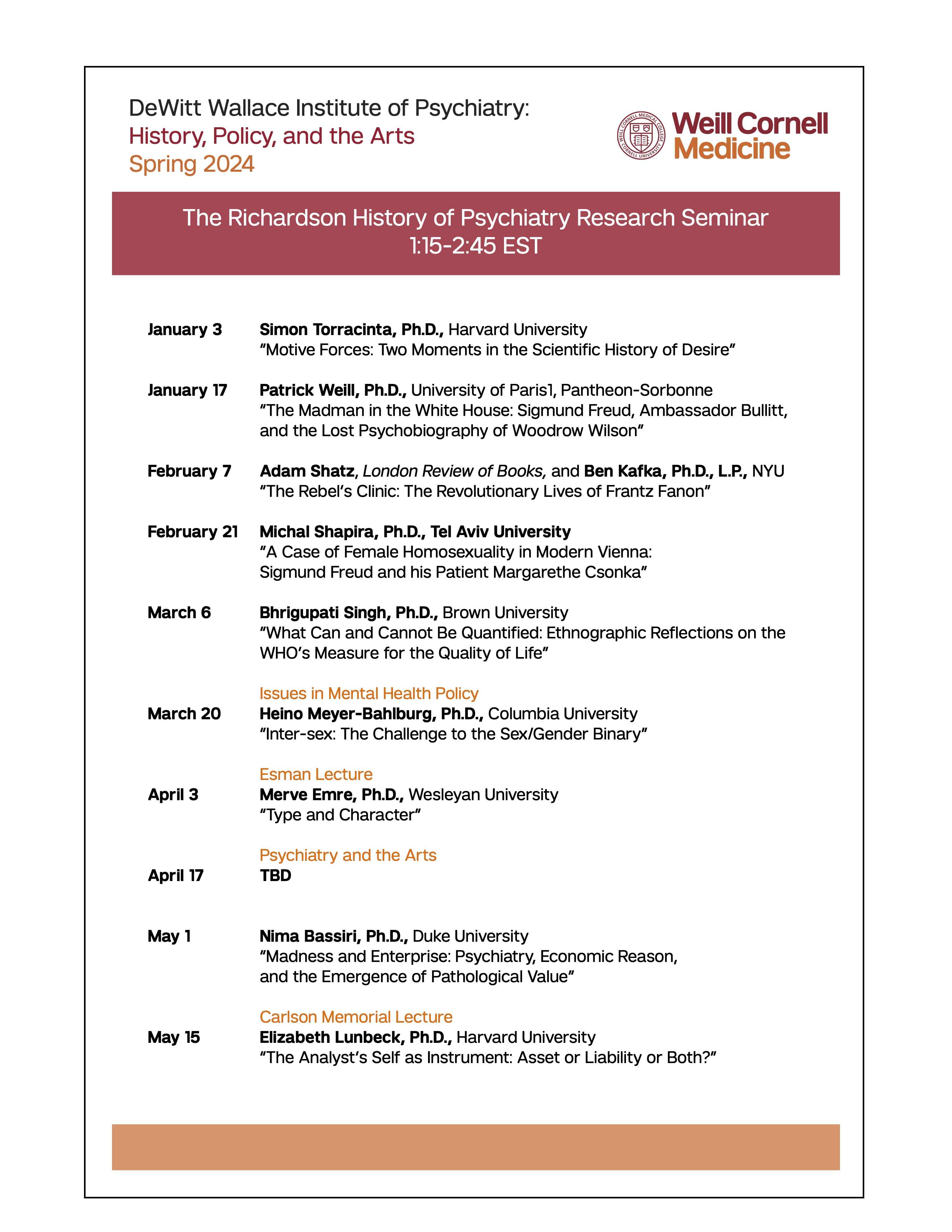 Richardson Seminar: Spring 2024 Schedule Posted on December 22, 2023 by Alexandra Bacopoulos-Viau Posted in UncategorizedTagged Richardson Seminar, Weill Cornell Share this: Click to share on Facebook (Opens in new window) Facebook Click to email a link to a friend (Opens in new window) Email Click to share on X (Opens in new window) X Like Loading... Related