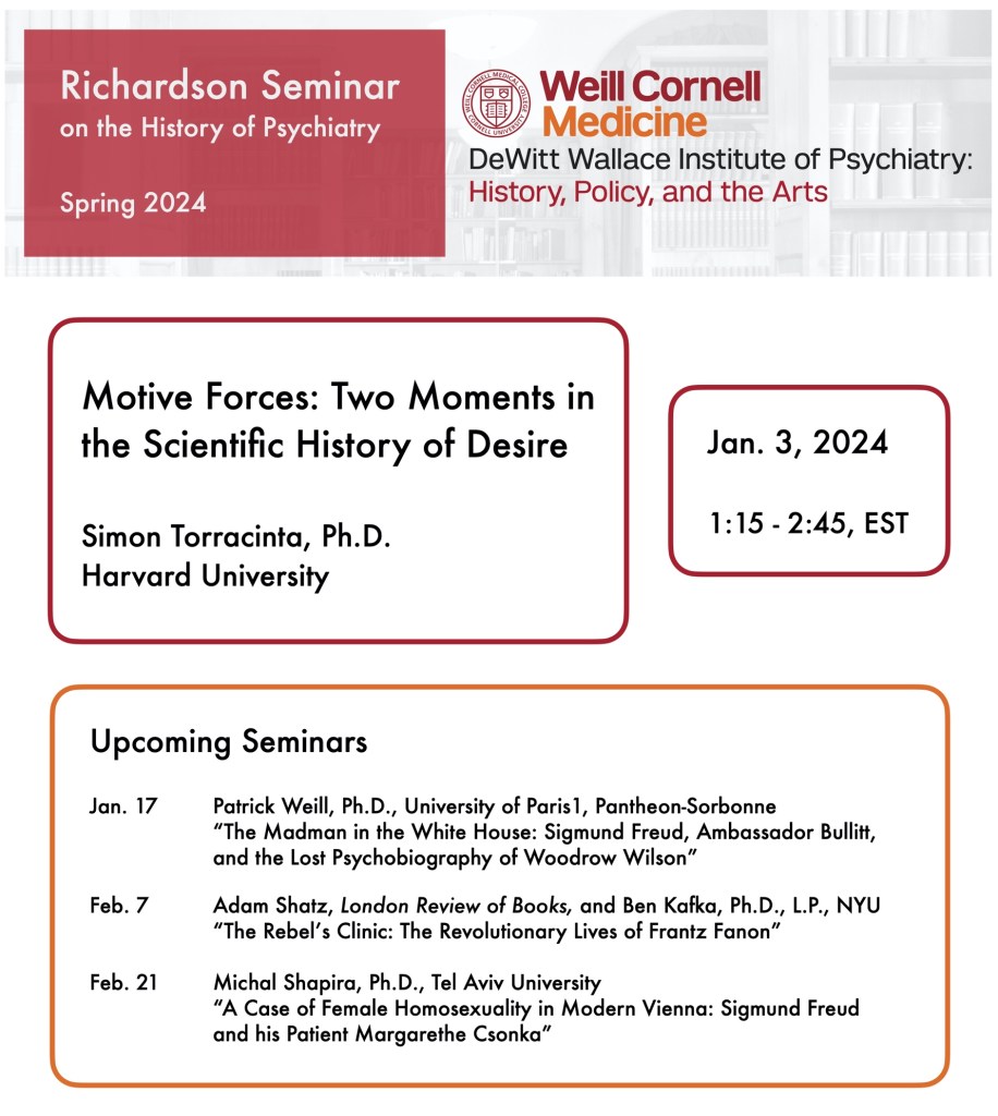 Please join us on Jan. 3, 1:15-2:45pm EST, for the next Richardson Seminar on the history of psychiatry. We will be joined by Simon Torracinta, Ph.D., Lecturer in History of Science at Harvard University, for a presentation titled “Motive Forces: Two Moments in the Scientific History of Desire.”