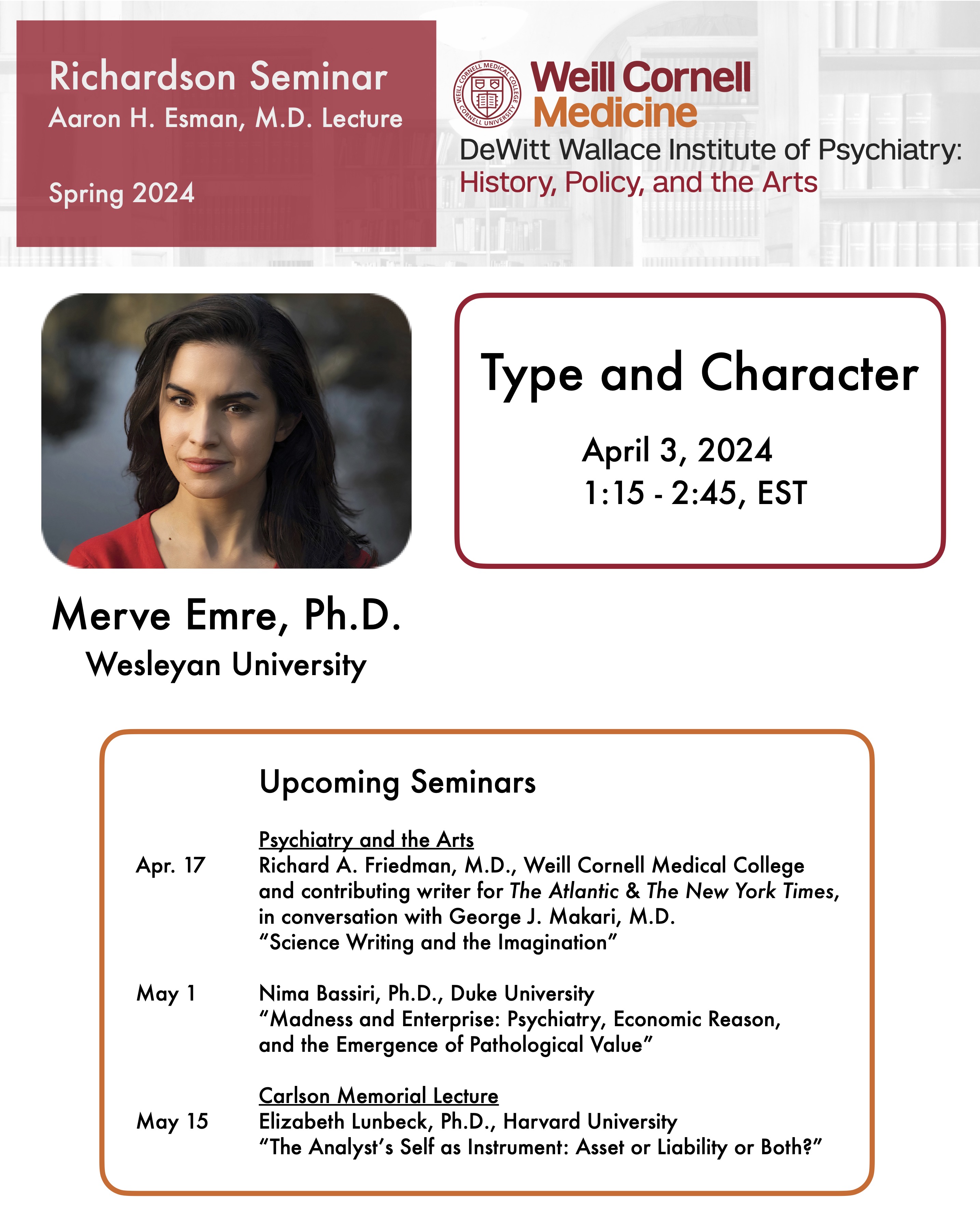 Please join us on April 3, 1:15-2:45 pm EST, for the annual Aaron H. Esman, M.D. Lecture. We will be joined by Merve Emre, Ph.D. for a lecture titled “Type and Character.” Professor Emre is the Shapiro-Silverberg Professor of Creative Writing and Criticism and the Director of the Shapiro Center for Creative Writing and Criticism at Wesleyan University.