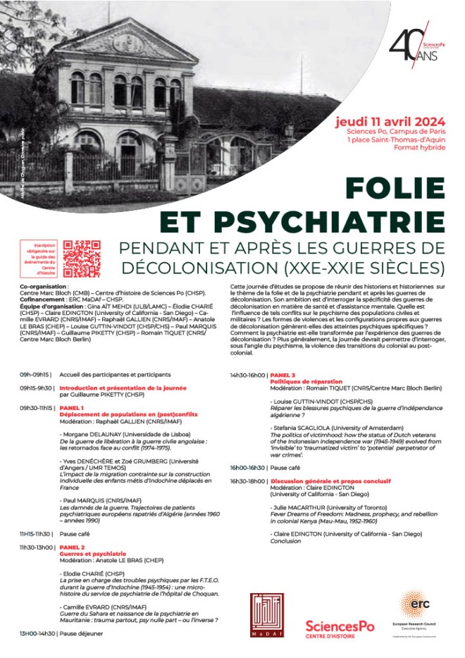 This symposium aims to bring together historians to explore the theme of madness and psychiatry during and after decolonization wars. Its ambition is to examine the specificity of decolonization wars in terms of mental health and assistance. What is the influence of such conflicts on the psyche of civilian and military populations? Do the forms of violence and configurations specific to decolonization wars generate specific psychological impacts? How is psychiatry transformed by the experience of decolonization wars? More generally, the symposium should allow for an examination, from the perspective of the psyche, of the violence inherent in transitions from colonial to post-colonial eras.