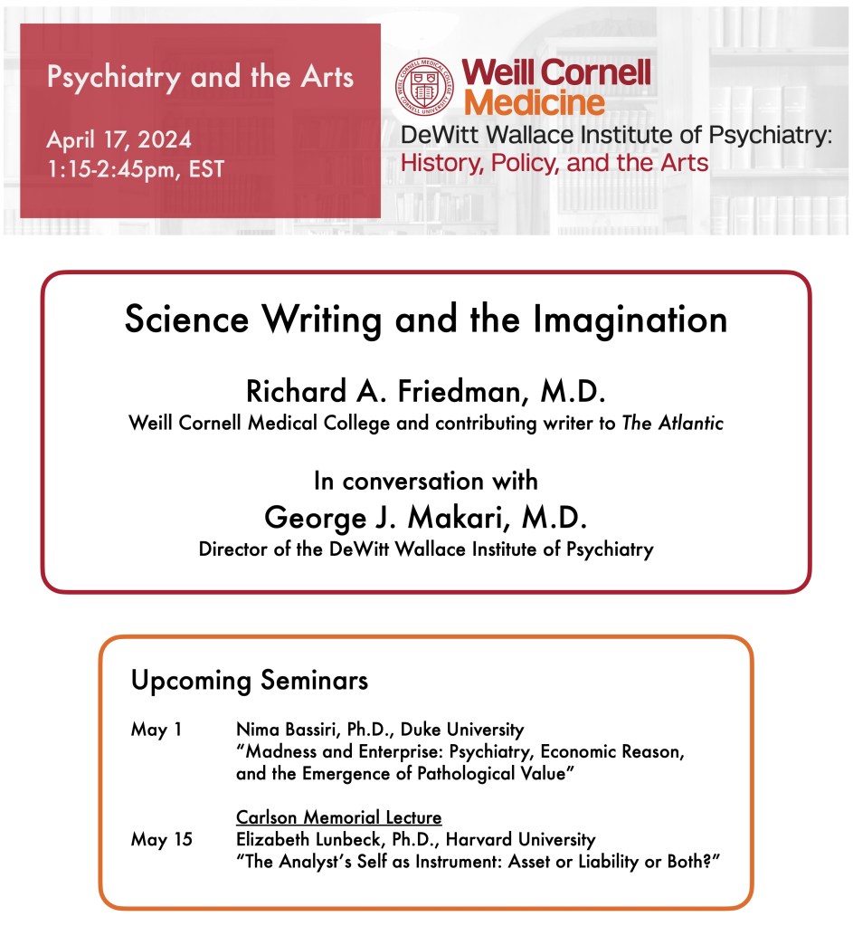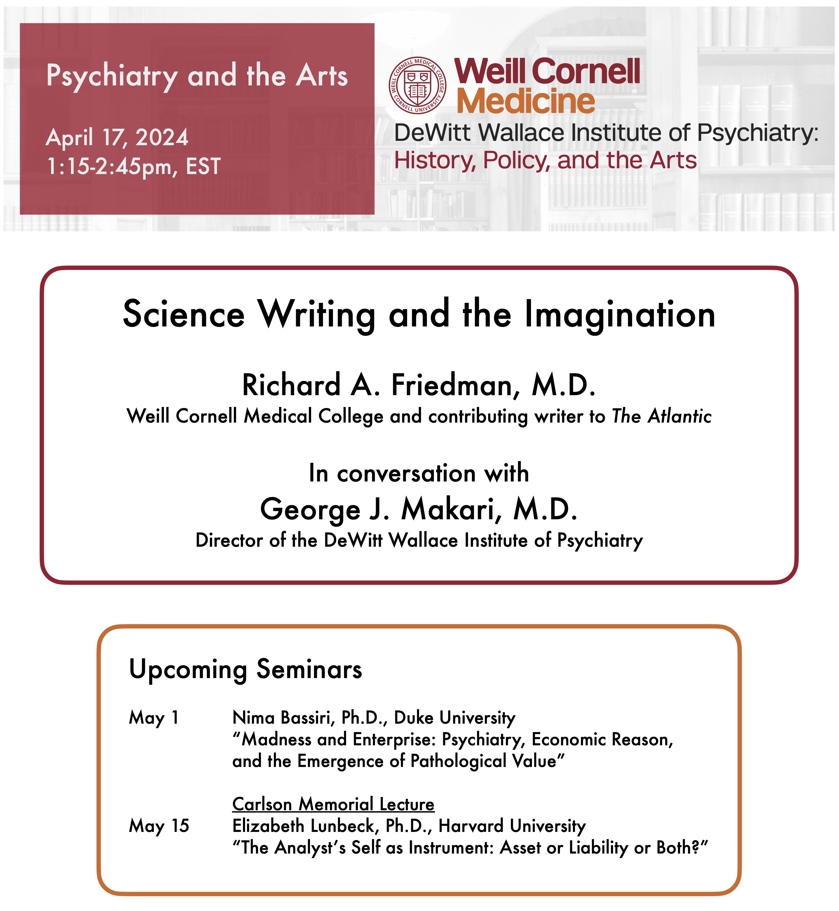 Please join us on April 17 at 1:15pm EST for the next seminar in our Psychiatry and the Arts series for a conversation on “Science Writing and the Imagination.” The Director of the DeWitt Wallace Institute of Psychiatry, Dr. George J. Makari, will be joined by Dr. Richard A. Friedman, Professor of Clinical Psychiatry and Director of the Psychopharmacology Clinic at Weill Cornell Medical College and contributing writer to The Atlantic and The New York Times.