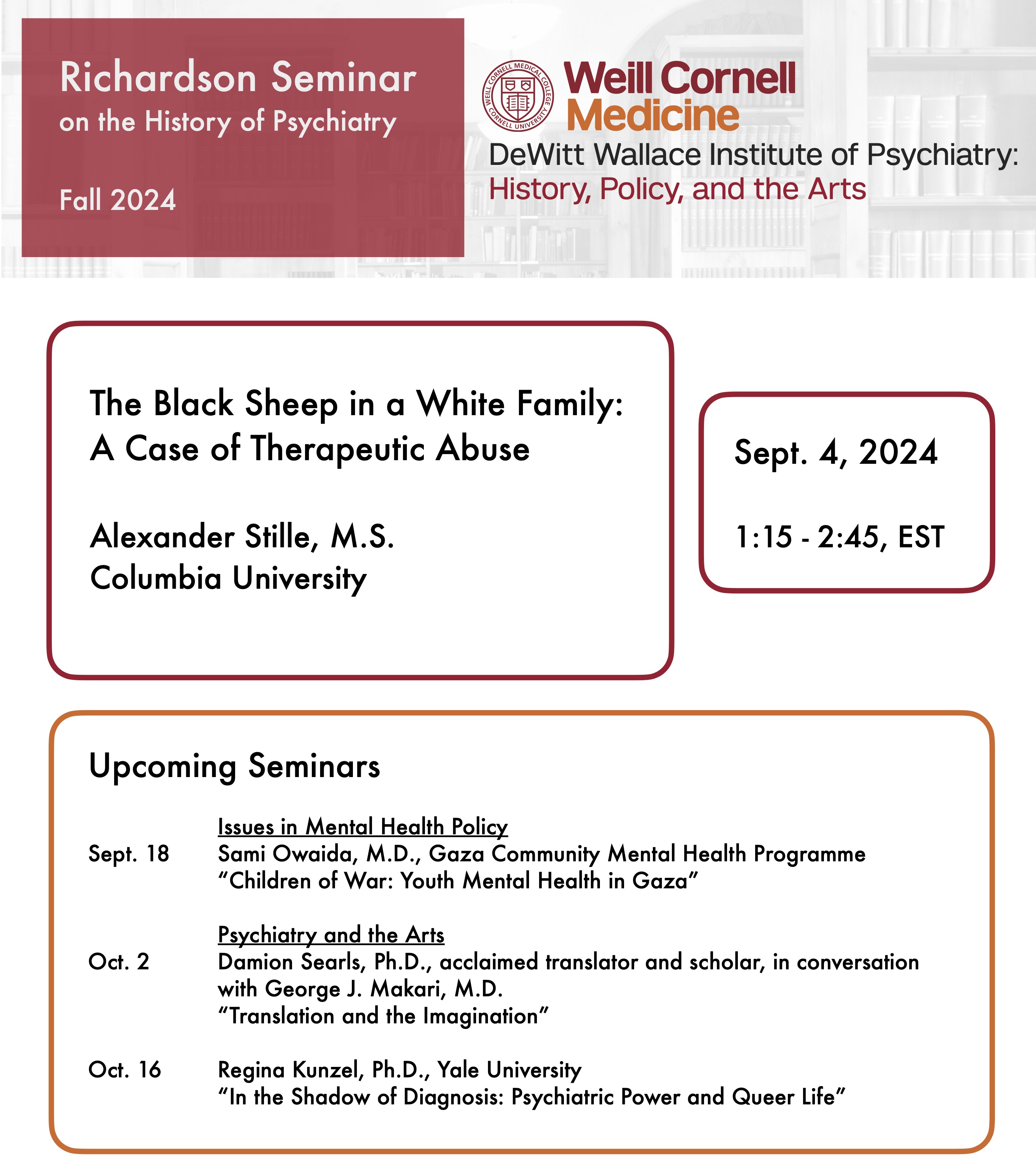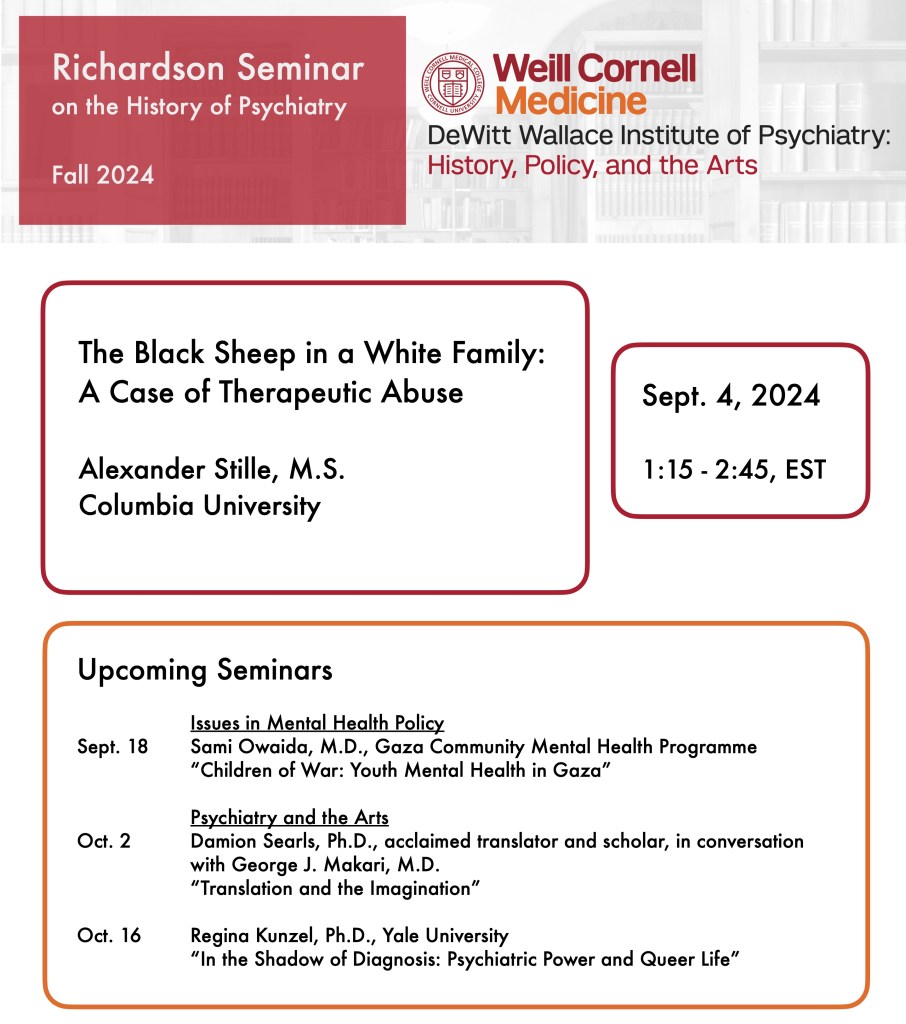 On Sept. 4th, the Richardson Seminar on the History of Psychiatry will begin the new academic year with a presentation by Alexander Stille, Professor of International Journalism at Columbia University, who will discuss his book, The Sullivanians: Sex, Psychotherapy, and the Wild Life of an American Commune.