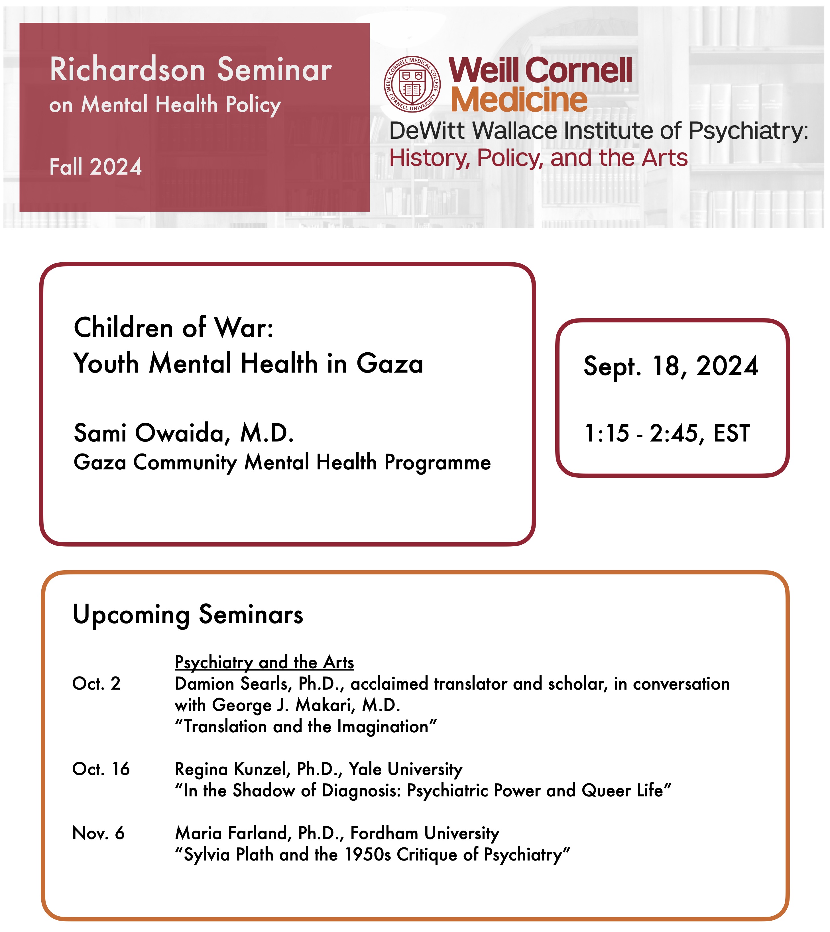 Please join us today (Sept. 18), 1:15-2:45pm EST, for the Richardson Seminar on Mental Health Policy. Dr. Sami Owaida, child & adolescent psychiatrist, will be joining us to discuss his work with the Gaza Community Mental Health Programme.