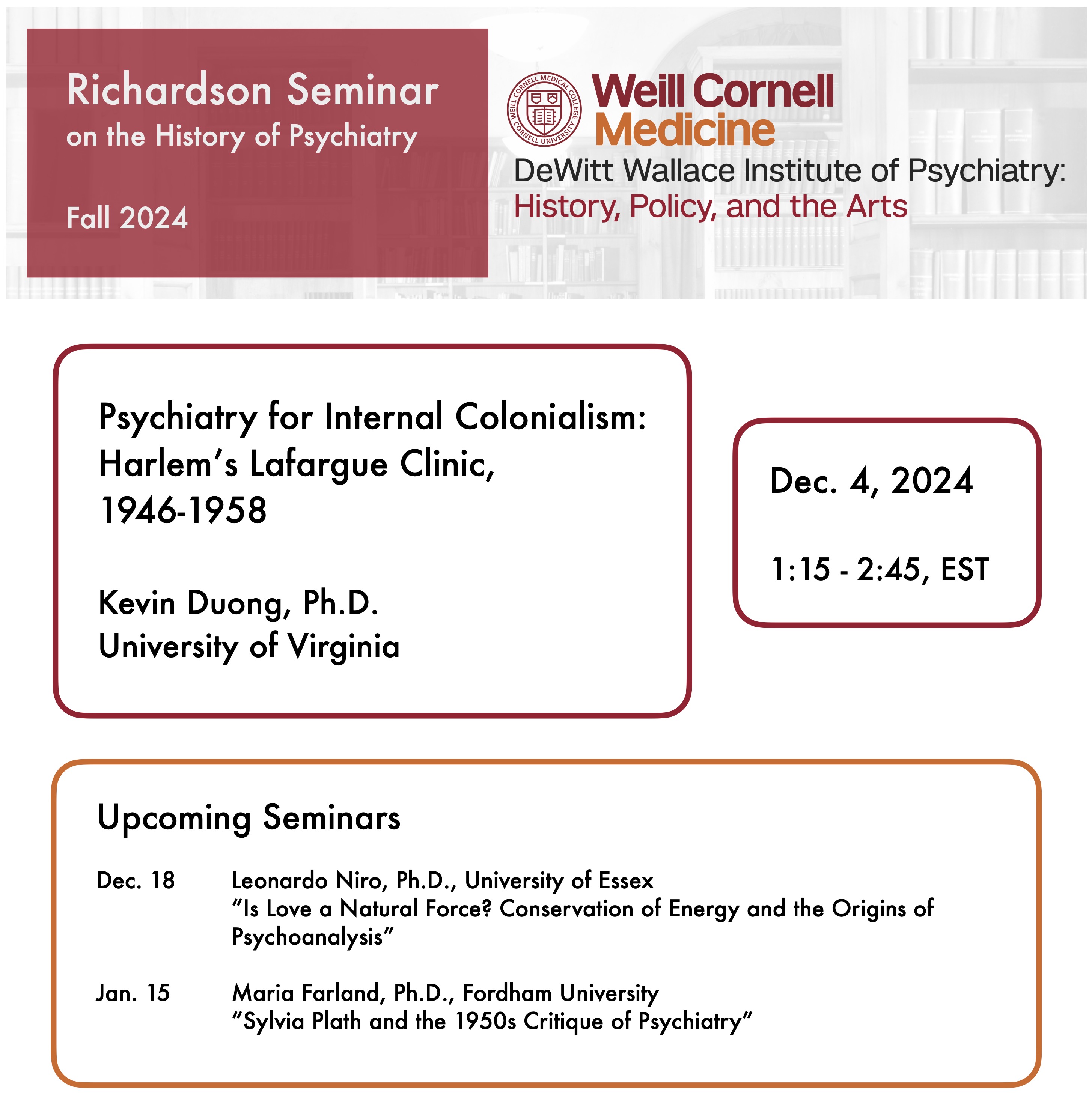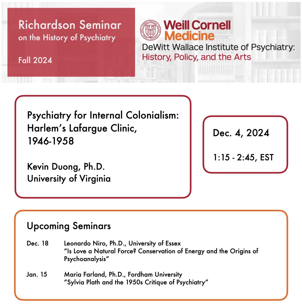 Please join us on Dec. 4 for the next Richardson Seminar on the History of Psychiatry. We will be joined by Kevin Duong, Ph.D., Associate Professor in the Dept. of Politics at the University of Virginia, for a presentation titled “Psychiatry for Internal Colonialism: Harlem’s Lafargue Clinic, 1946-1958.”