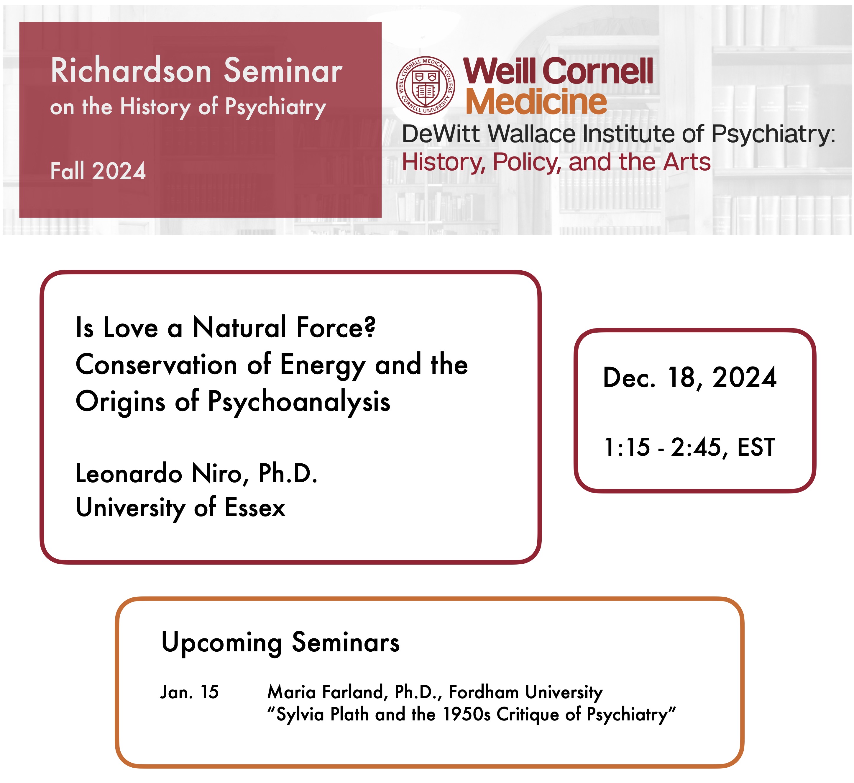 Dec. 18, Richardson Seminar: Leonardo Niro, Ph.D. on “Is Love a Natural Force?” Posted on December 16, 2024 by Alexandra Bacopoulos-Viau Posted in Uncategorized Share this: Click to share on Facebook (Opens in new window) Facebook Click to email a link to a friend (Opens in new window) Email Click to share on X (Opens in new window) X Like Loading... Related