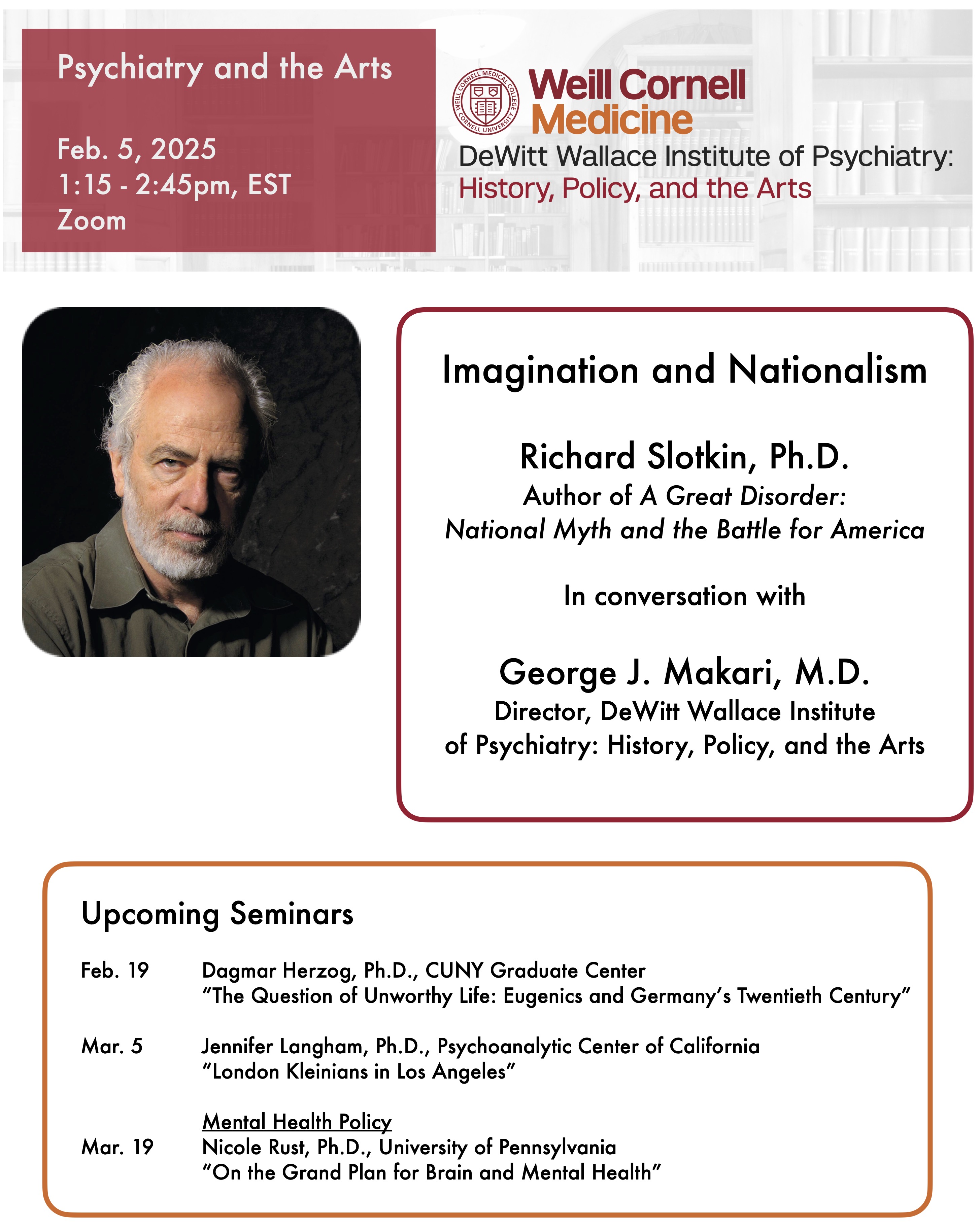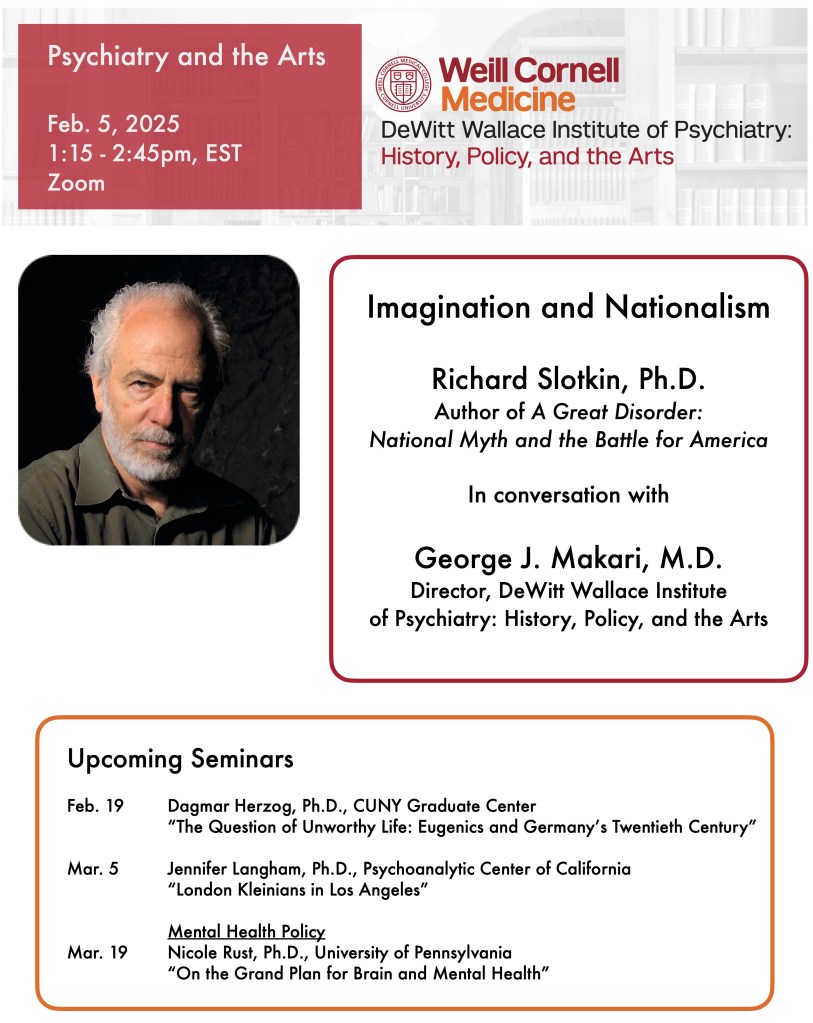 Please join us on Feb. 5, 1:15-2:45pm EST, for the Psychiatry and the Arts interview series on the imagination. The Director of the DeWitt Wallace Institute of Psychiatry, Dr. George J. Makari, will be joined by Richard Slotkin, Ph.D., author of The Great Disorder: National Myth and the Battle for America (Harvard University Press, 2024).