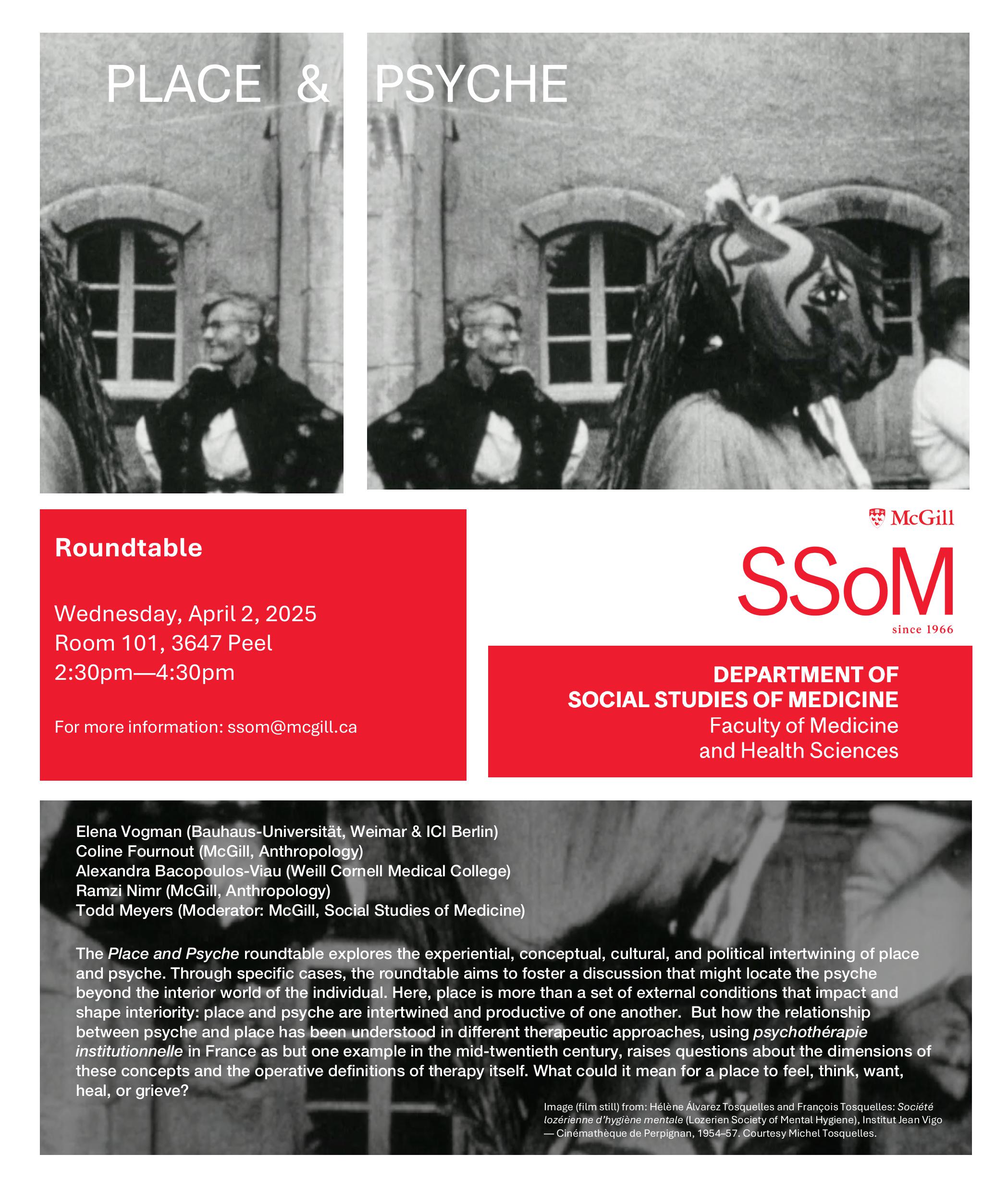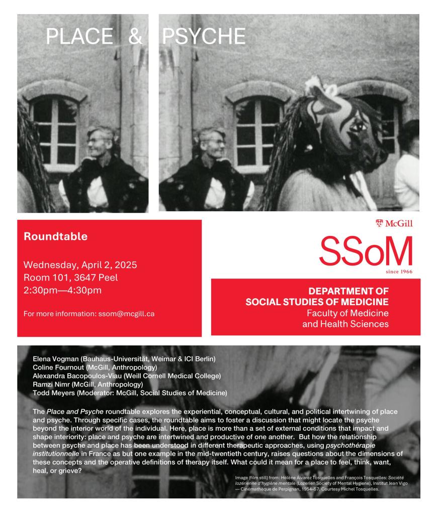 But how the relationship between psyche and place has been understood in different therapeutic approaches, using psychothérapie institutionnelle in France as but one example in the mid-twentieth century, raises basic questions about the dimensions of these concepts and the operative definitions of therapy itself. What could it mean for a place to feel, think, want, heal, or grieve? By extension, the roundtable will explore notions of atmosphere and ambience to think the psychic consistency of a place. The roundtable is a chance to explore the porous relationships of psyche and the environment, to imagine conscious and unconscious topographies, and to question how selves are done and undone through the spatialization of the psyche inside and outside therapeutic contexts.