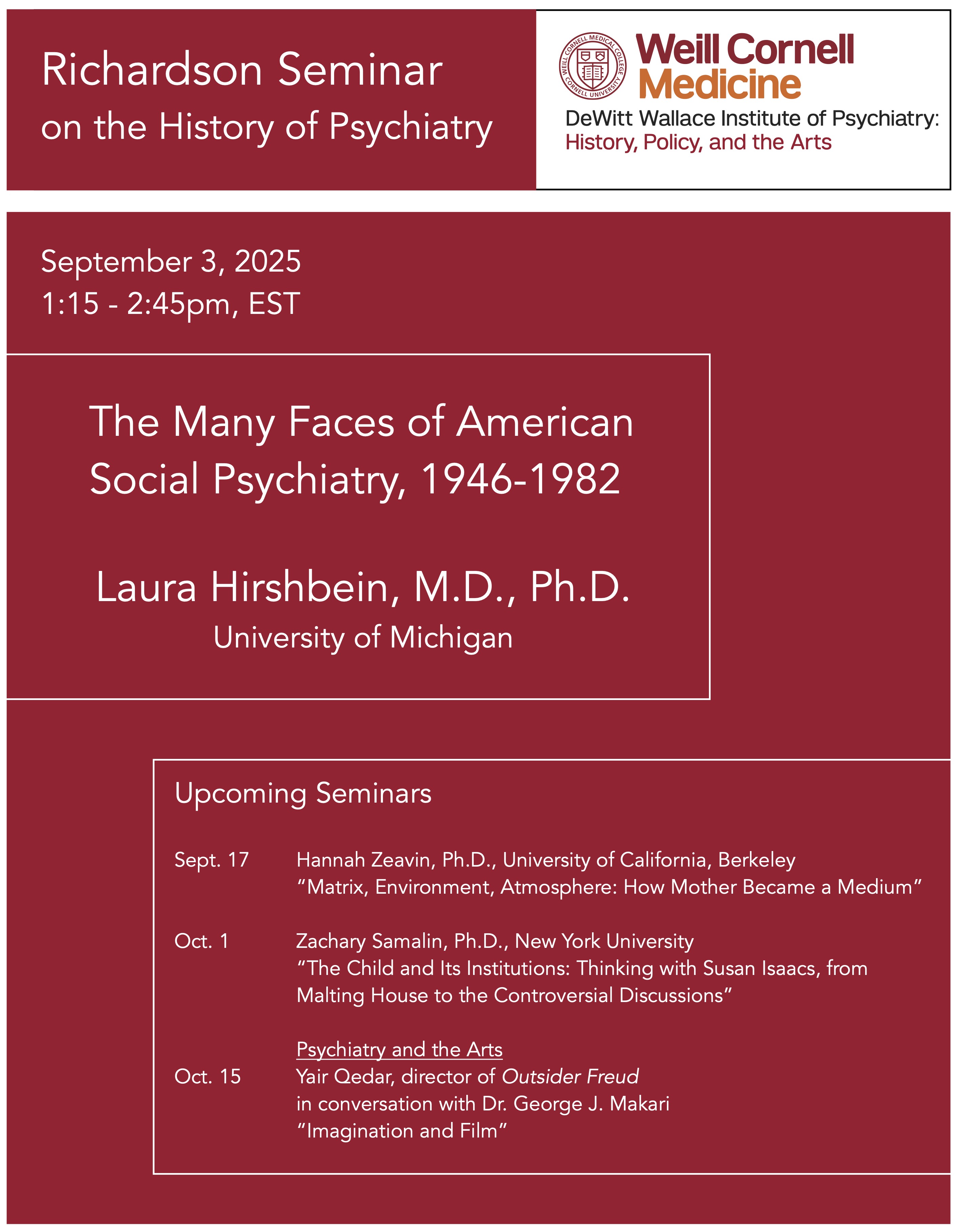 We are pleased to launch our 2025-26 series of the Richardson Seminar on the History of Psychiatry on September 3 with Laura Hirshbein, M.D., Ph.D., from the University of Michigan, who will give a talk entitled “The Many Faces of American Social Psychiatry (1946-1982).”