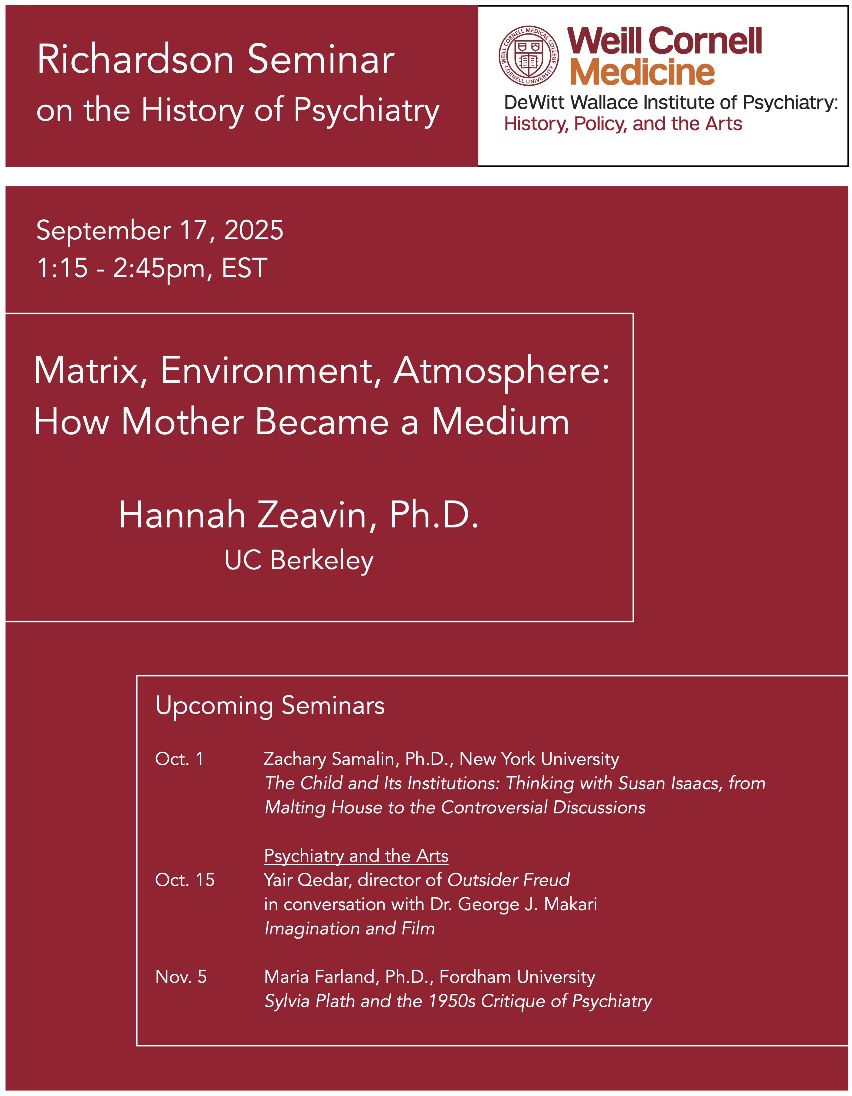 Please join us on September 17 for the next Richardson Seminar on the History of Psychiatry. We will be joined by Hannah Zeavin, Ph.D., Associate Professor of History at UC Berkeley, for a presentation titled “Matrix, Environment, Atmosphere: How Mother Became a Medium.” Professor Zeavin is the co-founder of The Psychosocial Foundation, Founding Editor of Parapraxis, and the author of the award winning books, The Distance Cure: A History of Teletherapy (2021, MIT Press) and Mother Media: Hot and Cool Parenting in the 20th Century (MIT Press, 2025).
