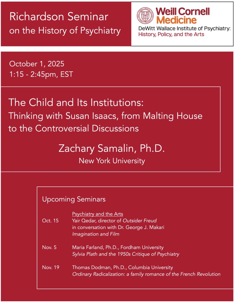 Please join us on October 1, 1:15-2:45pm EST, for the next Richardson Seminar on the History of Psychiatry. We will be joined by Zachary Samalin, Ph.D., Associate Professor of English at New York University, for a presentation titled “The Child and Its Institutions: Thinking with Susan Isaacs, from Malting House to the Controversial Discussions.” Professor Samalin is the author of The Masses are Revolting: Victorian Culture and the Political Aesthetics of Disgust (Cornell University Press, 2021).