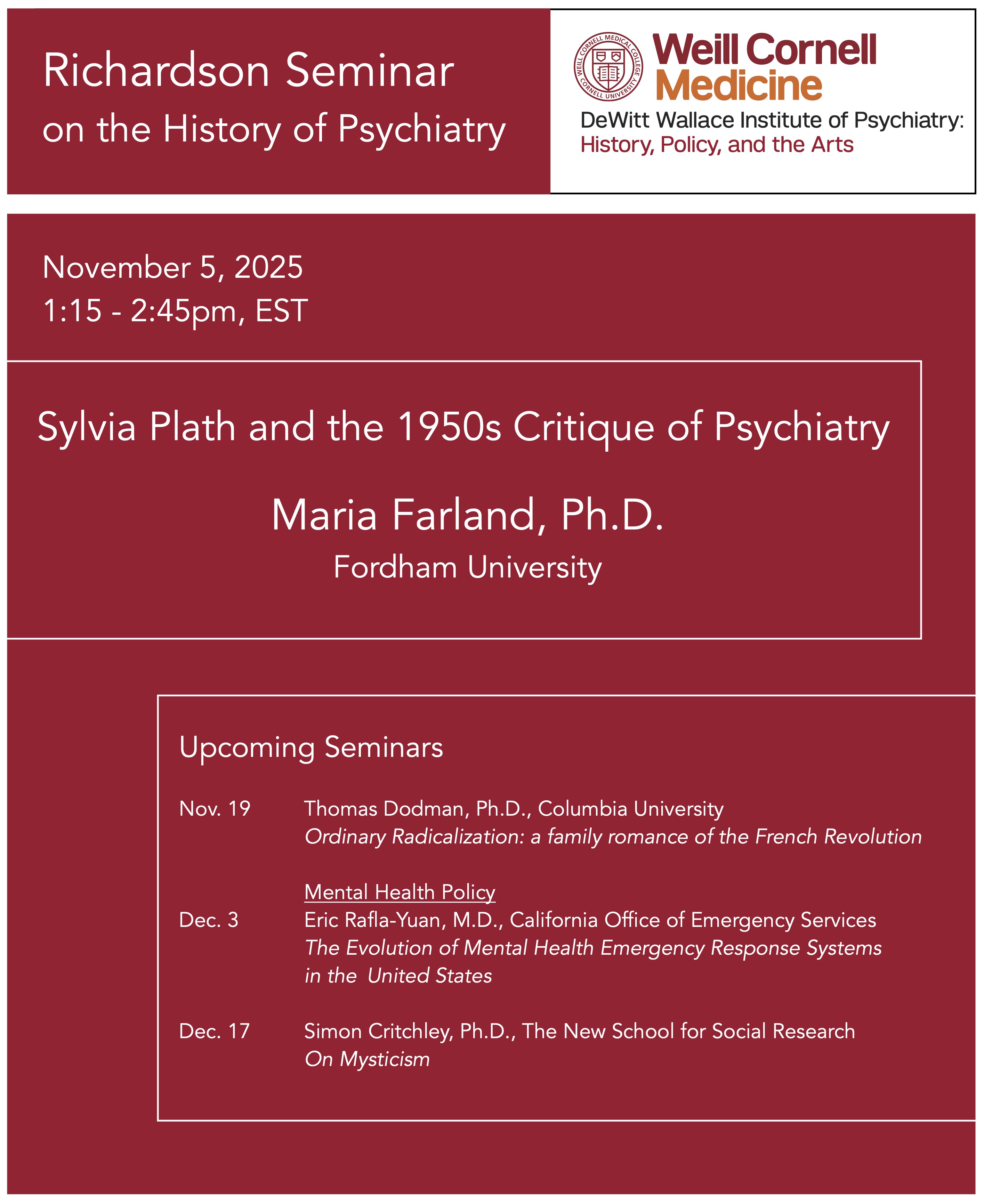 Please join us on November 5, 1:15-2:45pm EST, for the next Richardson Seminar on the History of Psychiatry. We will be joined by Maria Farland, Ph.D., Associate Professor of English at Fordham University, for a presentation titled “Sylvia Plath and the 1950s Critique of Psychiatry.”