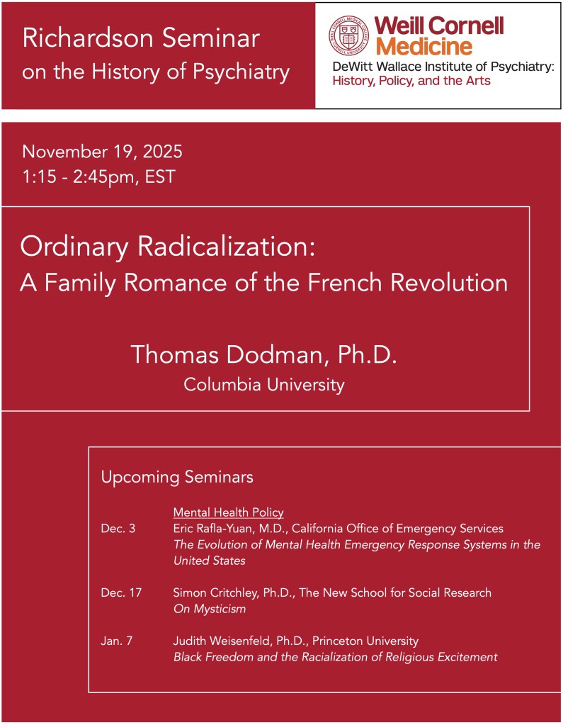 Please join us on November 19, 1:15-2:45pm EST, for the next Richardson Seminar on the History of Psychiatry. We will be joined by Thomas Dodman, Ph.D., Associate Professor of French at Columbia University, for a presentation titled “Ordinary Radicalization: A Family Romance of the French Revolution.”