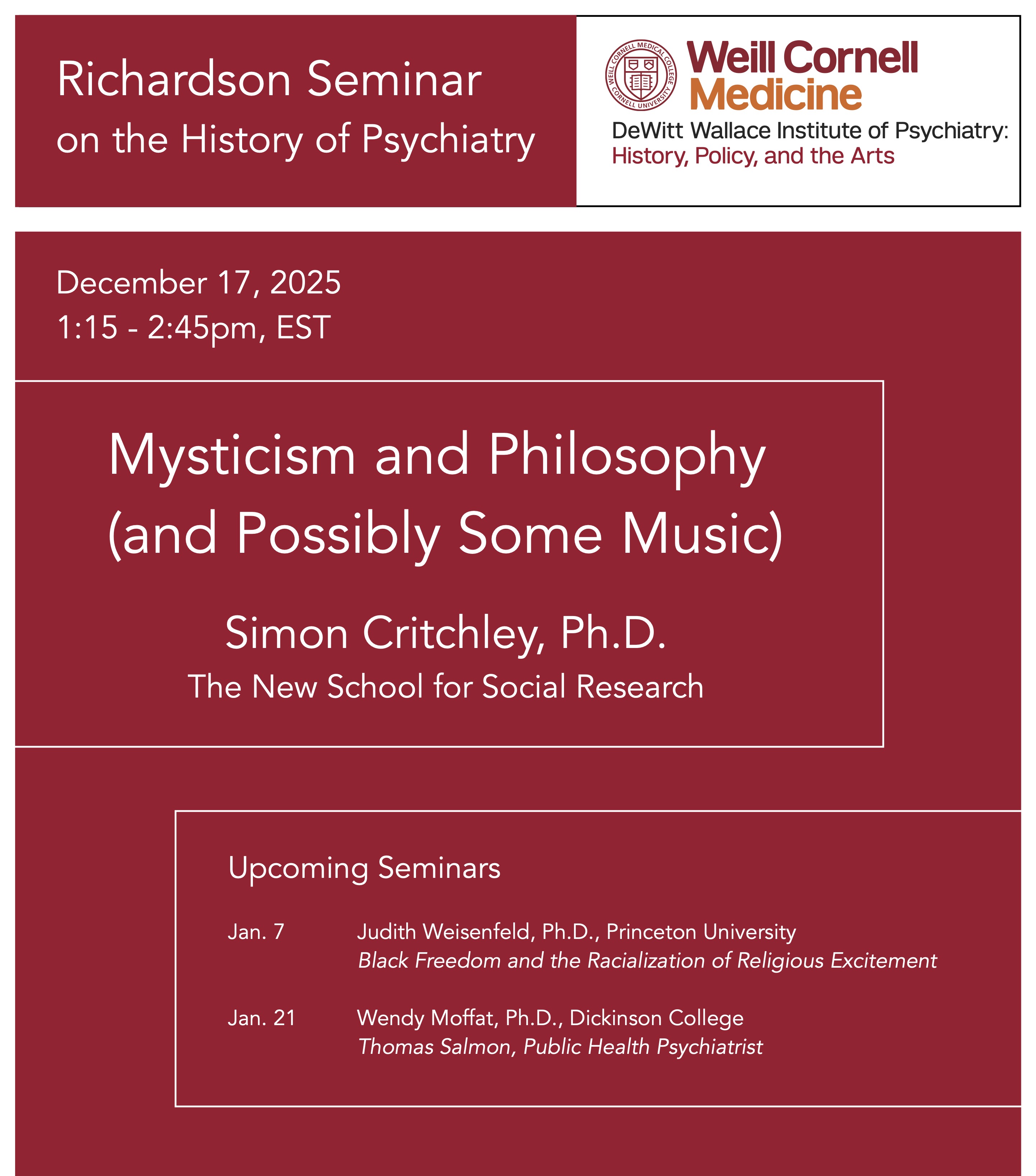 Please join us on December 17, 1:15-2:45pm EST, for the next Richardson Seminar on the History of Psychiatry. We will be joined by Simon Critchley, Ph.D., Hans Jonas Professor of Philosophy at The New School for Social Research, for a presentation titled “Mysticism and Philosophy (and Possibly Some Music).”